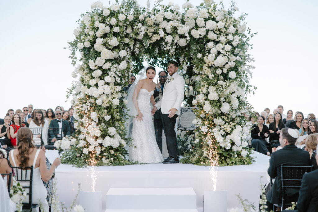 As guests arrived for the ceremony, they were greeted with a glass of bubbly and several instant wow moments: sweeping lakefront views, a dramatic 360-degree seating arrangement, and a 16-foot-tall chuppah adorned with hundreds of white flowers. The ceremony was stunning from start to finish, ending with the couple’s first kiss as newlyweds and a joyful exit through cold sparklers into cocktail hour.